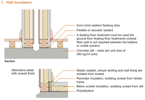 Light-framed separating walls can be erected directly on top of the slab following the raft foundation detail (above), but note that a floating floor treatment must be included (regardless of whether impact resistance is required), as this shields the junction at the base of the wall.